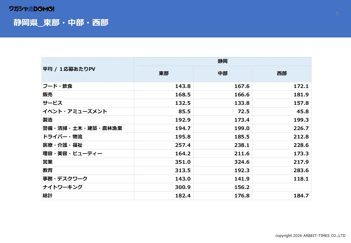 ワガシャ de DOMO パフォーマンスレポートは、地域・職種別の1応募あたりに必要なPV数のデータです。